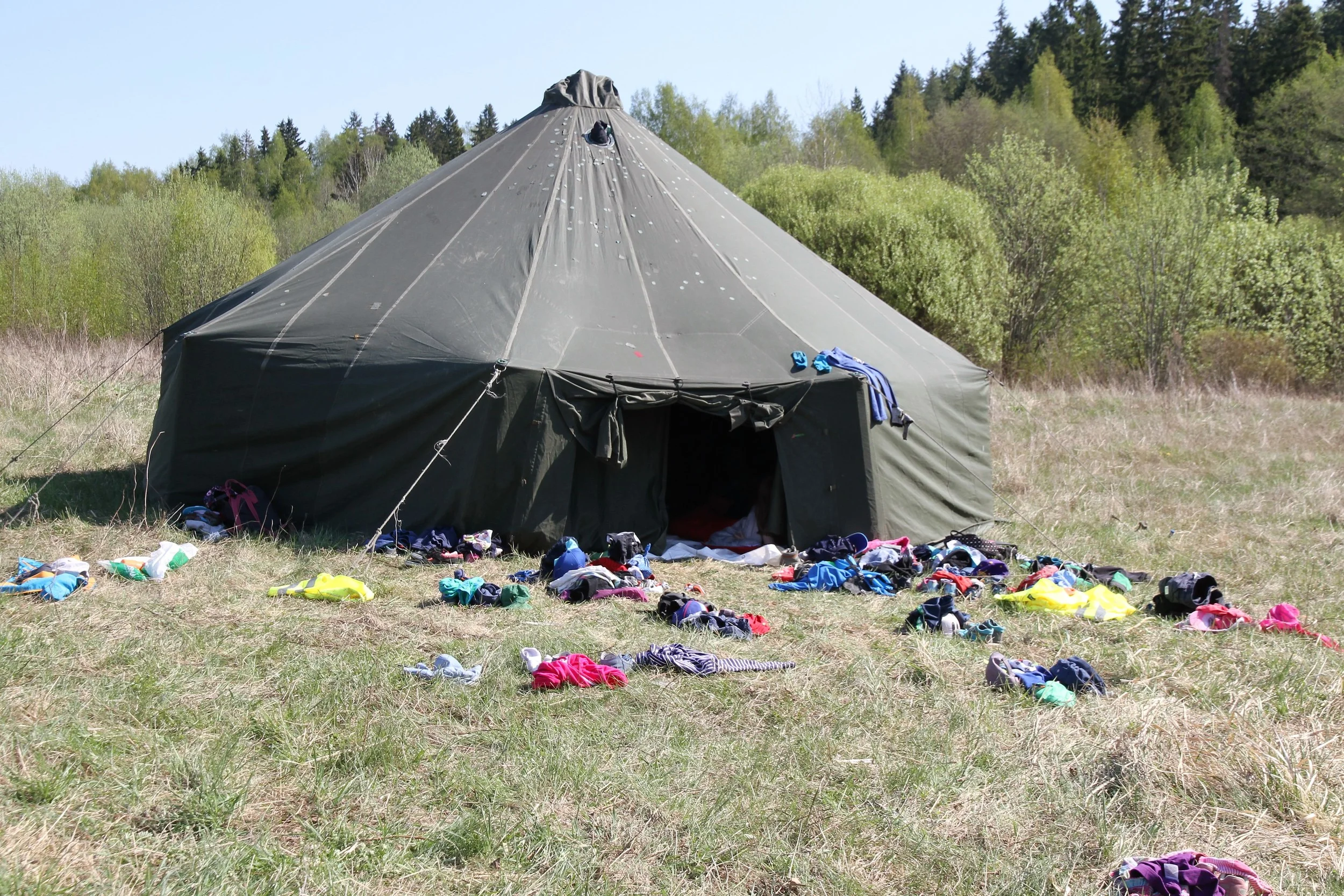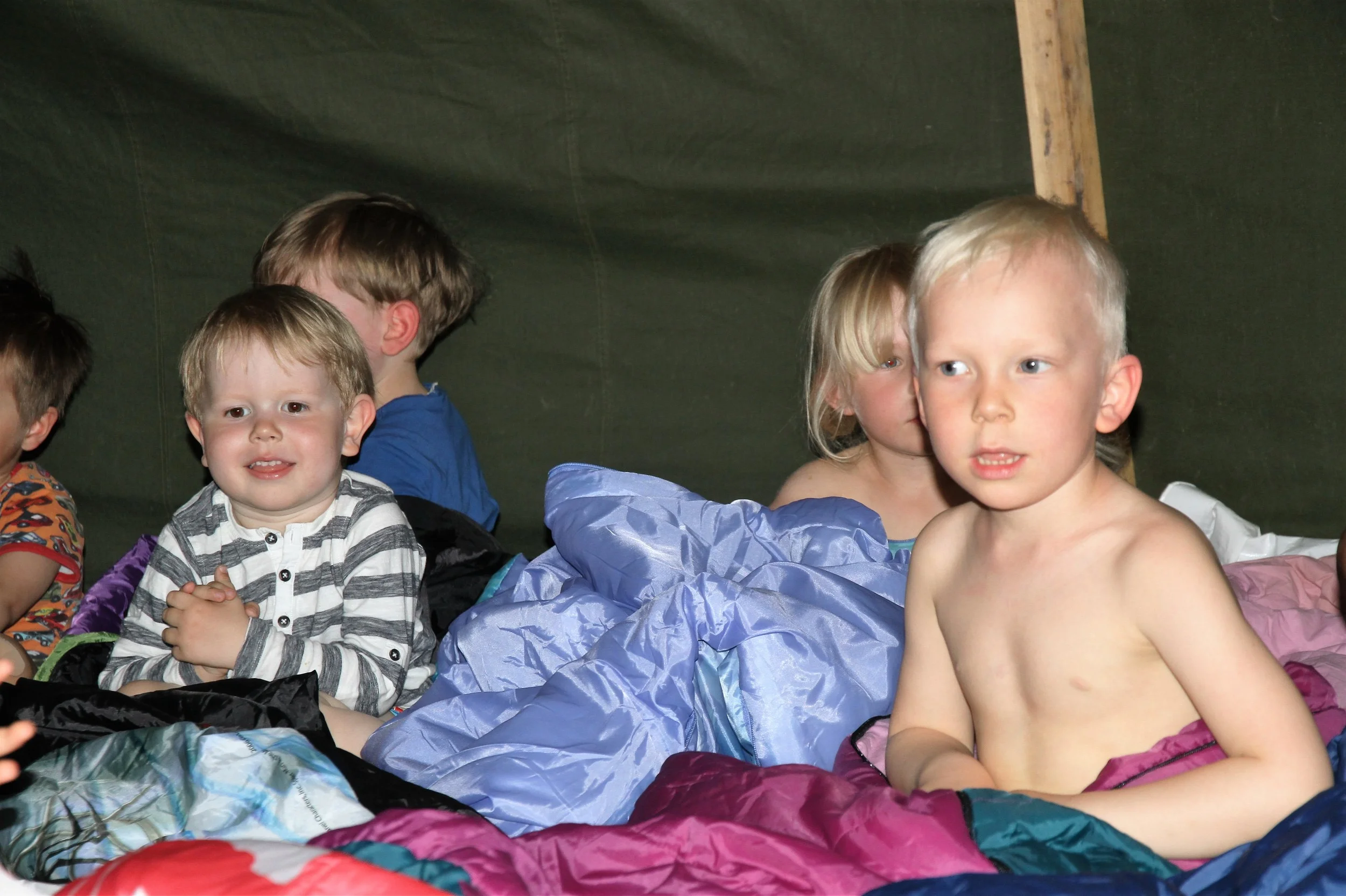 Sitten kaivelimme makuupussit ja kömmimme puolijoukkuetelttaan. Kuumahan siellä oli kuin saunassa, mutta kuinka monelle lapselle se oli ihan ensimmäinen kerta, kun sai kaivaa oman makuupussin esille ja kömpiä sinne.